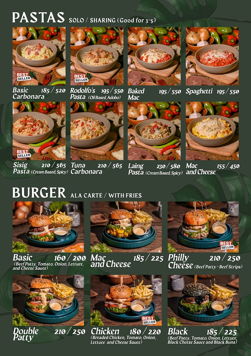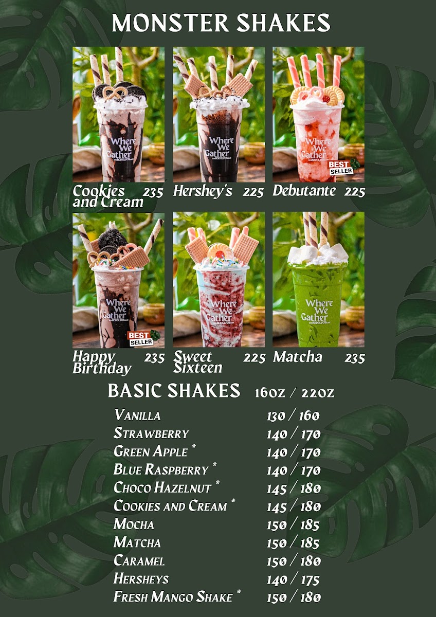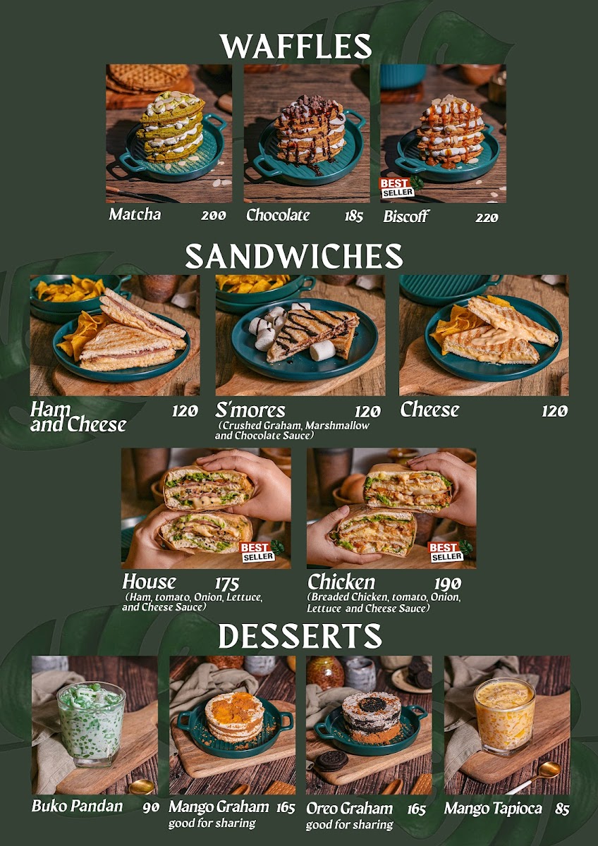 Highlights include rich frappes like the Chocolate Chip Cookie and Hazelnut, perfect for an afternoon pick-me-up, alongside savory dishes such as the Monster Burger, Carbonara Pasta, and Mixed Siomai Bilao. Light snacks like Nachos Supreme or Spam and Fries make for great companions to their warm and cozy atmosphere.